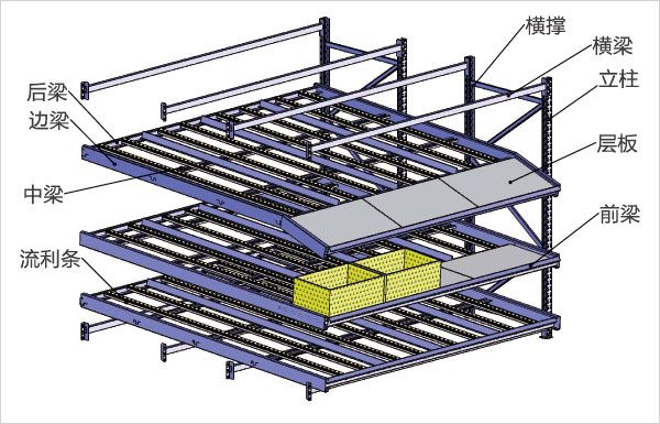 流利式貨架簡稱流利架,是將貨物置于滾輪上,利用一邊通道存貨,另一邊通道取貨。料架朝出貨方向向下傾斜,貨物在中立作用下向下滑動。可實現先進先出,并可實現一次補貨,多次揀貨。流利架存儲效率高。適合大量貨物的短期存放和揀選。流利架廣泛應用于配送中心、裝配車間以及出貨頻率較高的倉庫。