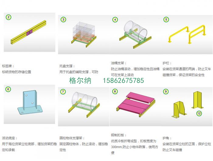 可根據存儲單元集裝設備的特性加裝如:隔檔、鋼層板(木層板)、金屬絲網層、倉儲籠導軌、油桶架等功能性附件。滿足不同單元集裝設備形式的貨物存儲。