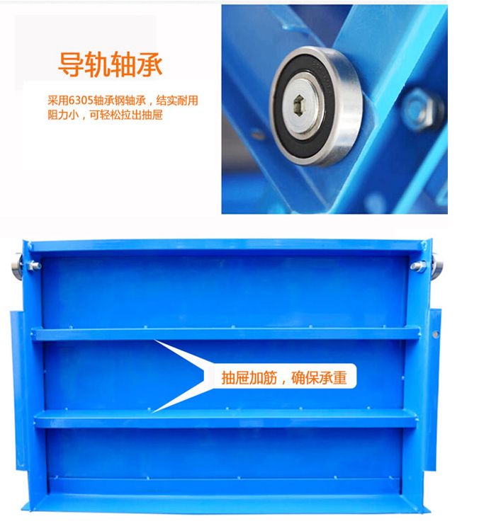 每條滑軌由兩個軸承前后上下固定,可以在導向槽內隨意滾動,阻力小,可以輕松拉出抽屜。