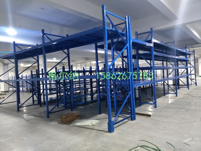4、橫梁與立柱片掛接組裝成框架,較后鋪設(shè)鋼層板,至此一組完整的中型貨架成型。